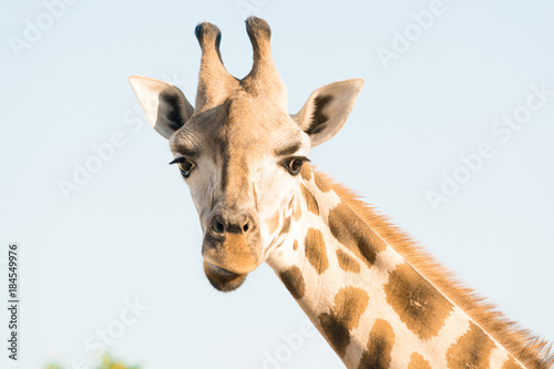 Naklejka premium Portrait of an African giraffe. Head and long neck. Wild animal.