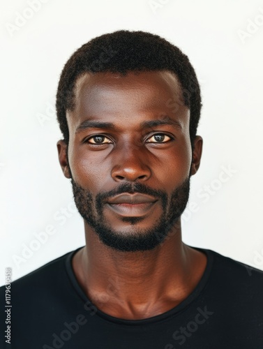 © The 2R Artificiality, Obraz premium Portrait of an African man with a confident expression on a bright white background showcasing ample negative space for text placement.