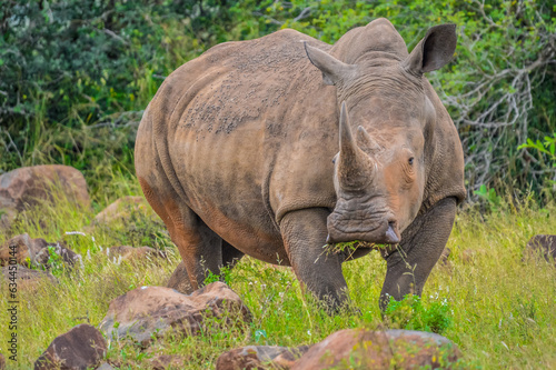 © shams Faraz Amir, Naklejka premium Portrait of an African white Rhinoceros or Rhino or Ceratotherium simum also know as Square lipped Rhinoceros in a South African game reserve