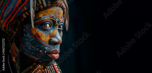© Rara, Fototapeta premium portrait of an African woman with a color pattern on her face on a dark background, copy space
