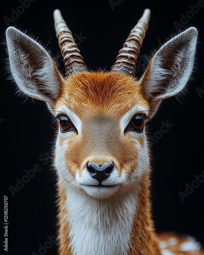 Fototapeta premium portrait of an antelope with smooth, short fur in warm shades of brown, beige, and white, shown in close-up against a black background that highlights its elegance and calm demeanor