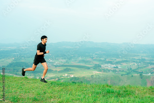 © Ekkasit A Siam, Obraz premium Portrait of an Asian male trail runner running. On the high mountains there are beautiful views. It's a trail running practice. on a bright day Behind is a beautiful mountain view.