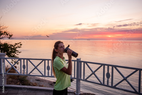 Obraz premium Portrait of an athlete who drinks water from a sports bottle. A young woman quenches her thirst with a fitness drinker. Maintaining water balance during training at sunrise. Girl's morning routine.