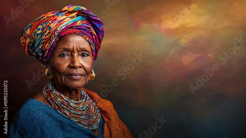 © authapol, Obraz premium Portrait of an Elderly African Woman with Weathered Face, Vibrant Head Wrap, and Colorful Beaded Necklaces Against a Warm Abstract Background