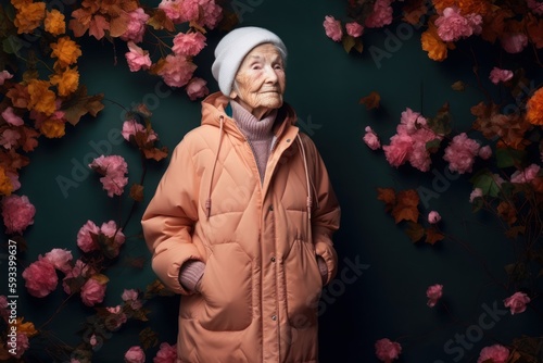Fototapeta premium Portrait of an elderly woman in a pink jacket and hat.