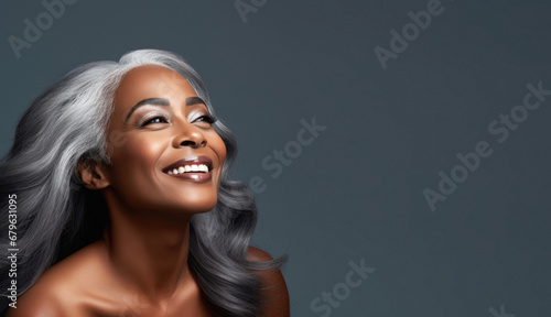 Fototapeta premium Portrait of an elegant mature woman with smooth healthy skin, long gray hair, and a joyful smile. Cosmetics and beauty advertising.