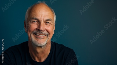 Obraz premium Portrait of an every day man, bald and smiling against a solid blue background