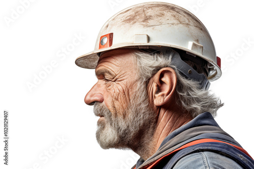 © venusvi, Fototapeta premium Portrait of an experienced construction worker wearing a hard hat, showcasing determination and commitment to his craft.