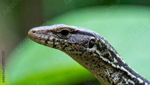 © panca, Naklejka premium Portrait of an impressive Monitor Lizard staring into the natural green bokeh