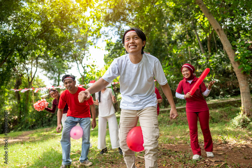 © Leo Lintang, Fototapeta premium Portrait of an Indonesian southeast asian people celebrate Indonesia Independence Day on the 17th of August with a game of keep the balloon from blowing out outdoors. Concept of Kemerdekaan Indonesia