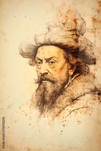 © HC FOTOSTUDIO, Fototapeta premium Portrait of an old man from the Renaissance with ink and watercolor.