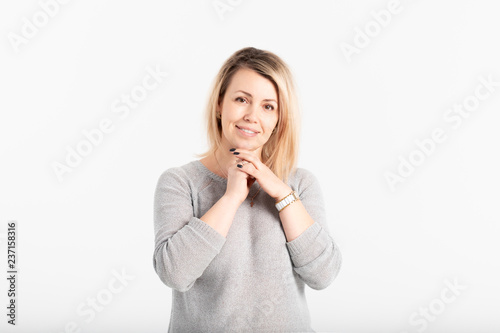 Fototapeta premium Portrait of attractive and smiling middle aged woman on grey background