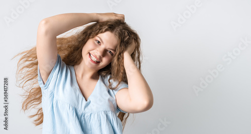 Obraz premium Portrait of attractive carefree european girl, tilting head up and shaking curly hair. Living life to fullest. Having fun and being amused. Copy space for your text