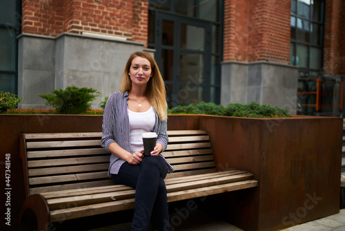 Obraz premium Portrait of attractive female student with disposable takeaway cup resting at...