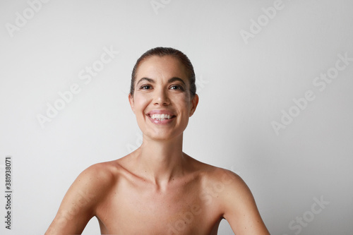 © face_reader_img, Obraz premium Portrait of attractive middle aged European lady looking at the camera posing isolated over white wall background.