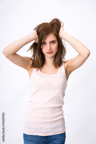 © Drobot Dean, Fototapeta premium Portrait of attractive woman posing over gray background