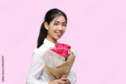 Fototapeta premium Portrait of attractive young Asian woman holding a bouquet of red roses on...