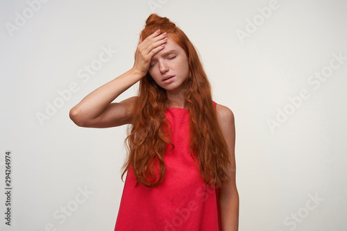 © timtimphoto, Fototapeta premium Portrait of attractive young readhead lady wearing with casual hairstyle standing over white background in pink dress, feeling sick and raising palm to her forehead, frowning with closed eyes