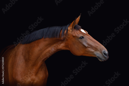 © vprotastchik, Obraz premium portrait of bay trakehner mare horse with white spot on forehead isolated on black background