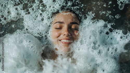 Fototapeta premium Portrait of beaming woman rubbing body with foam while standing under steam...