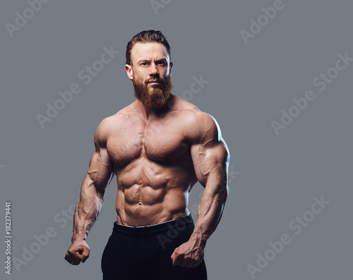 Fototapeta premium Portrait of bearded shirtless bodybuilder.