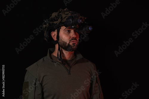 © Dmitri, Fototapeta premium Portrait of bearded special forces soldier wearing helmet with night vision goggles isolated on black background for military concepts