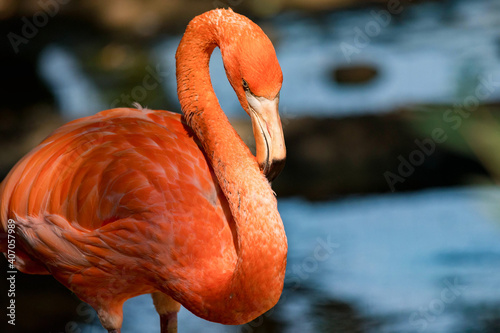 Fototapeta premium Portrait of beautiful american flamingo or Phoenicopterus ruber near water