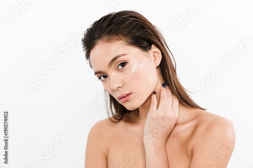 © Drobot Dean, Obraz premium Portrait of beautiful asian woman after bath with wet brown hair looking on camera, isolated over white background