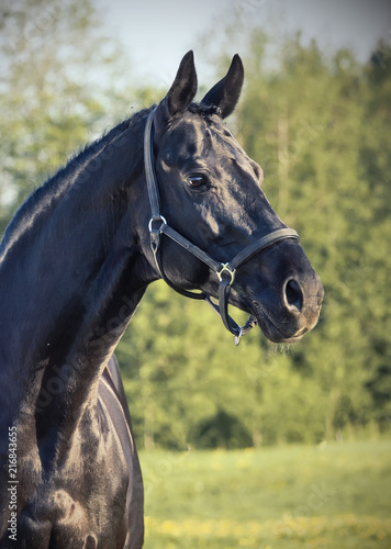 Obraz premium Portrait of beautiful black breed stallion. summer
