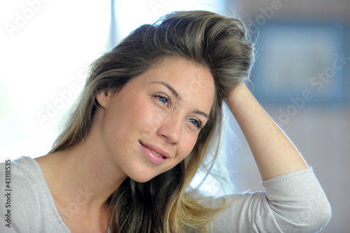 Fototapeta premium Portrait of beautiful blond woman relaxing in sofa