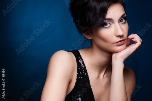 Naklejka premium Portrait of beautiful brunette woman in black dress.