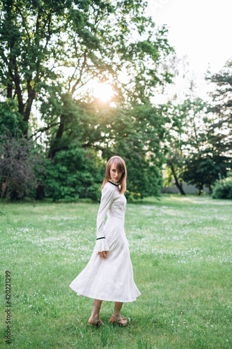 © alex, Naklejka premium Portrait of beautiful caucasian woman in long white retro dress walking in green summer blossom park on meadow. Rays of sunlight. Lady girl. Book cover