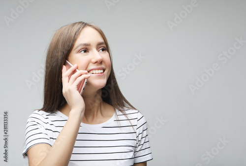Fototapeta premium Portrait of beautiful cheerful woman talking on mobile phone