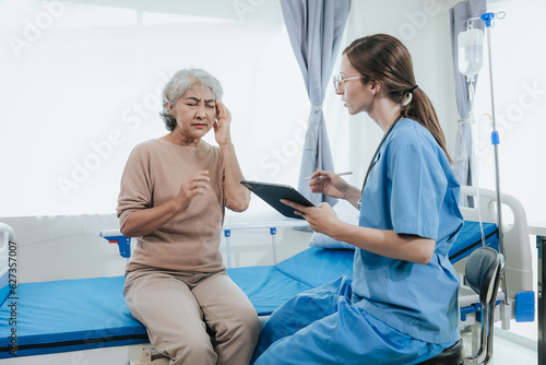 © Witoon, Obraz premium Portrait of beautiful doctor sharing data from digital tablet with elderly patient