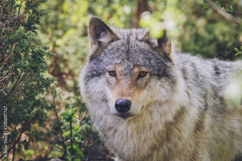 © Jon Anders Wiken, Naklejka premium Portrait of beautiful grey wold in nature scenery in summer. Moment, predator, holiday, wilderness, wildlife concept.