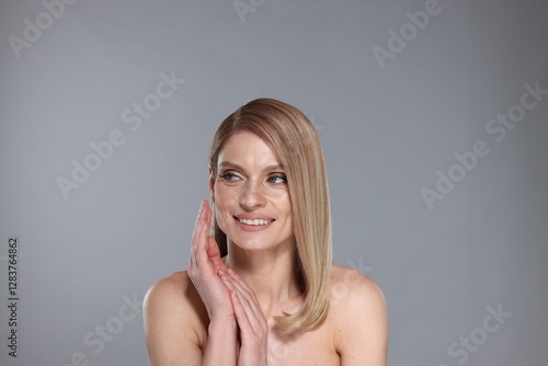 © New Africa, Obraz premium Portrait of beautiful happy woman with straight blonde hair on grey background