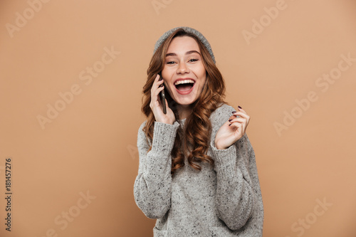 © Drobot Dean, Fototapeta premium Portrait of beautiful laughing brunette woman in warm clothes talking on mobile phone, looking at camera