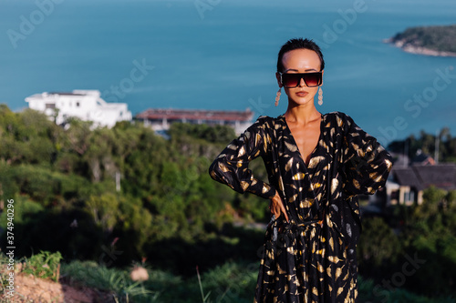 Fototapeta premium Portrait of beautiful luxury look fit tanned slim woman in black golden cape and sunglasses on top of mountain with amazing sea view in Thailand.