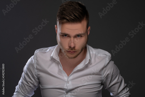 © Bogdan, Fototapeta premium Portrait of beautiful man on grey background. Studio Isolated