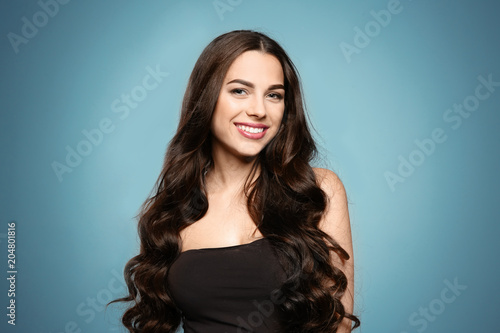 Naklejka premium Portrait of beautiful model with gorgeous curly hair on color background