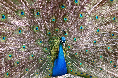 Obraz premium Portrait of beautiful peacock with feathers out.