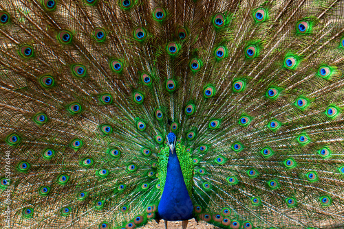 Naklejka premium Portrait of beautiful peacock with feathers out