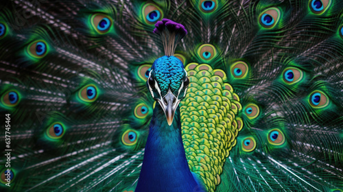 Obraz premium Portrait of beautiful peacock with feathers out. Generative Ai