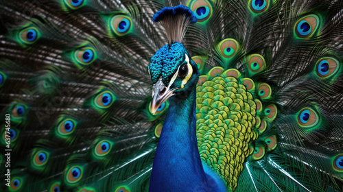 Obraz premium Portrait of beautiful peacock with feathers out. Generative Ai