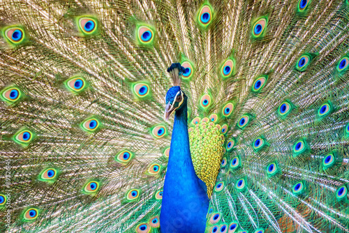 © martinhosmart083, Fototapeta premium Portrait of beautiful peacock with it feathers out