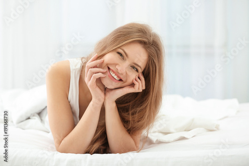 Fototapeta premium Portrait of beautiful smiling woman in bed at home