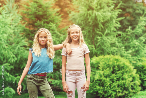 Fototapeta premium Portrait of beautiful teenager girls twins at park.