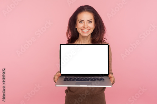 Naklejka premium Portrait of beautiful woman holding laptop with white screen copy space, mock up display for internet advertising, online service, website promotion. indoor studio shot isolated on pink background