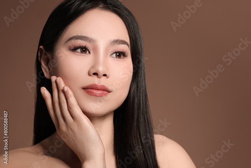 Obraz premium Portrait of beautiful woman on brown background, space for text