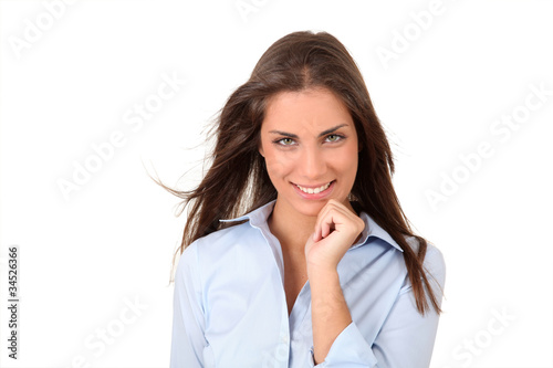 © goodluz, Fototapeta premium Portrait of beautiful woman with hand on chin